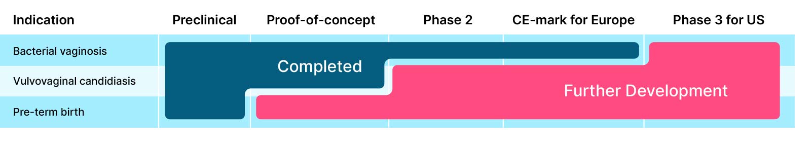 pHyph has established proof-of-concept in treatment of vulvovaginal candidiasis (VVC) in a recently finalized phase 2-trial (EpHect, CL4). It is an opportunity for a partner to investigate the possibility of a product with dual effect for treatment of both bacterial vaginosis and vulvovaginal candidiasis.